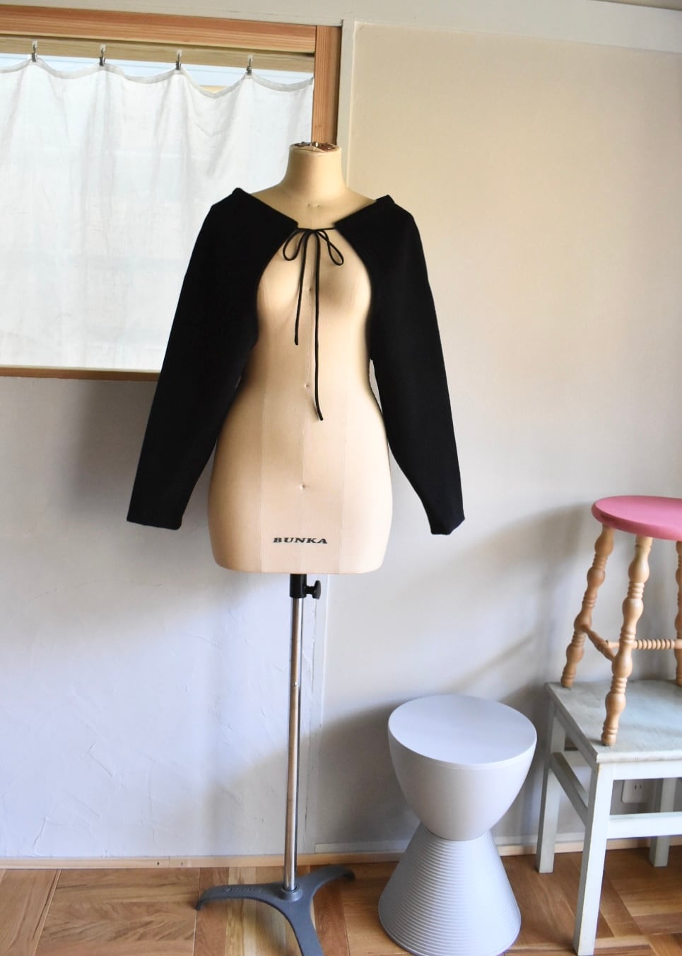黒の方は細かいワッフルのような表情のある柔らかくて暖かいアンゴラウール、細い紐は一点ずつシルクの生地で作っています。