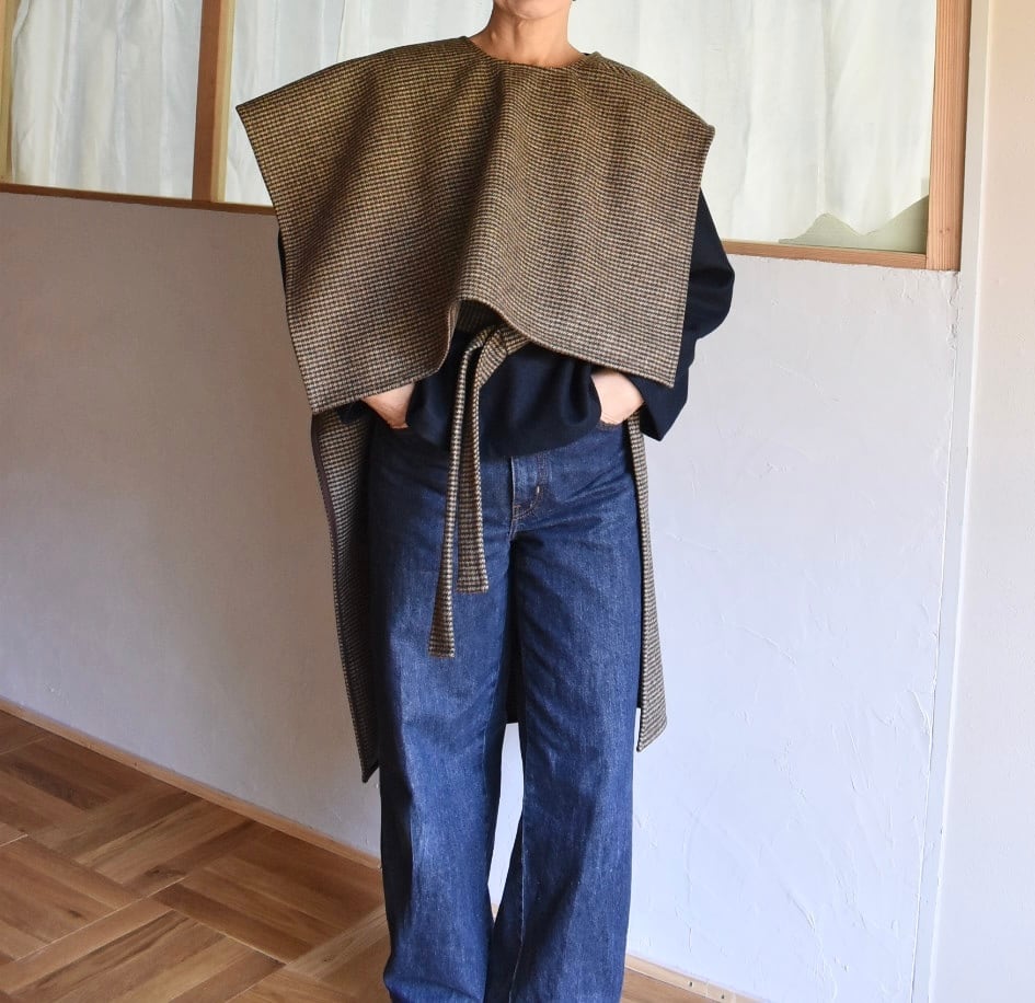 左右、前後で長さの違うアシンメトリーのウールケープ。