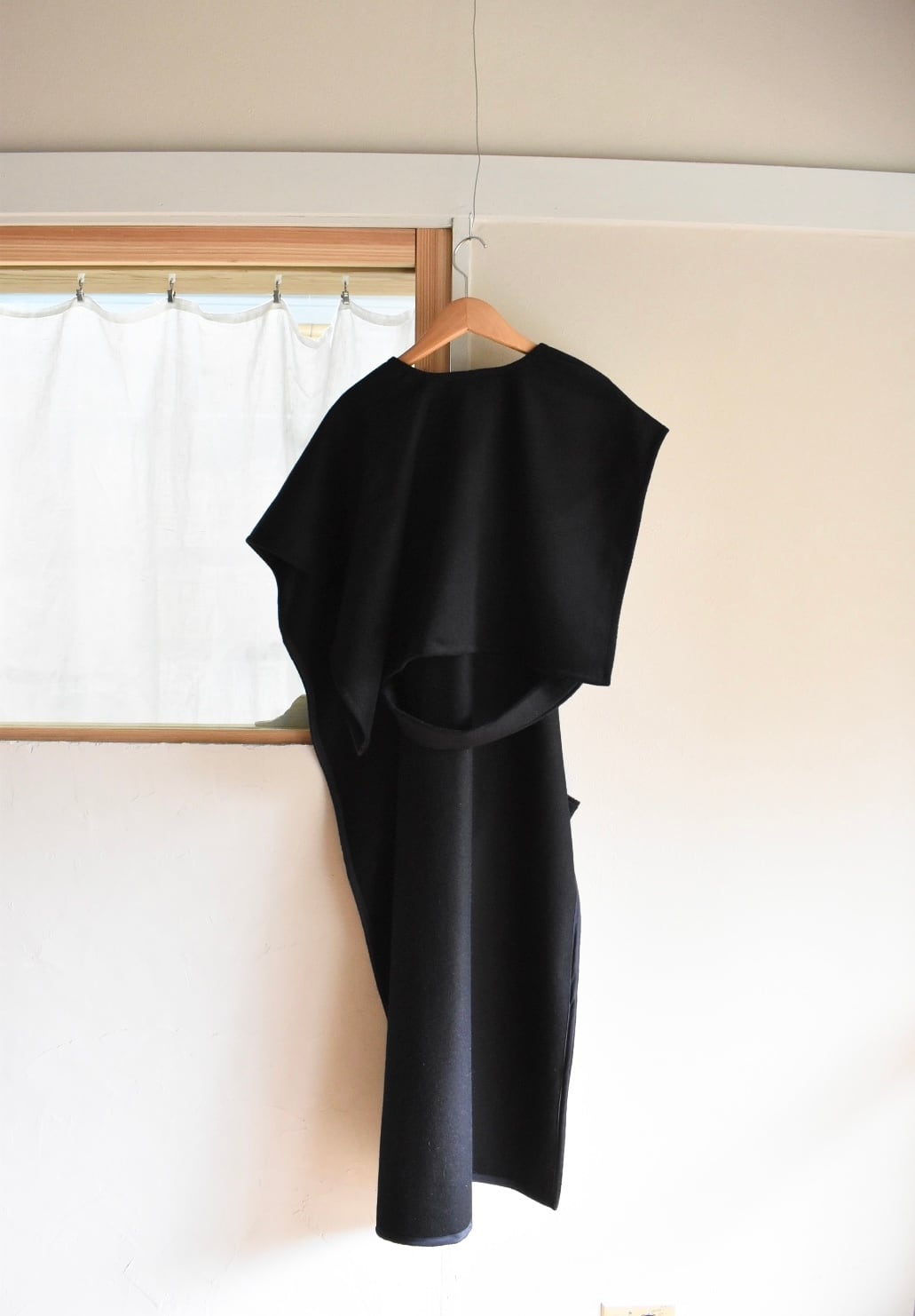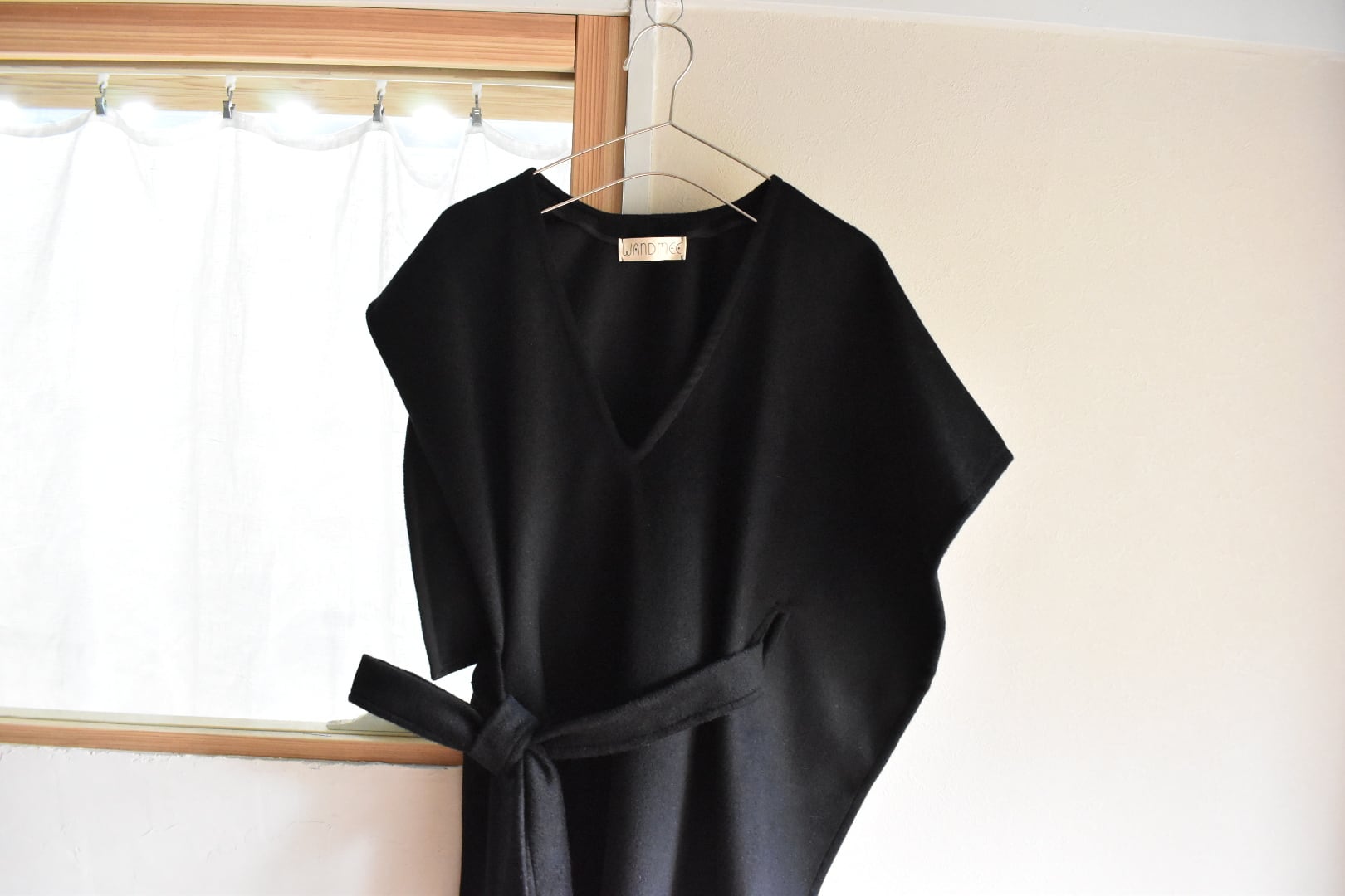 左右と前後の長さの違い、ウエストにひとつあるホールに紐ベルトを通して結んで着用するケープです。