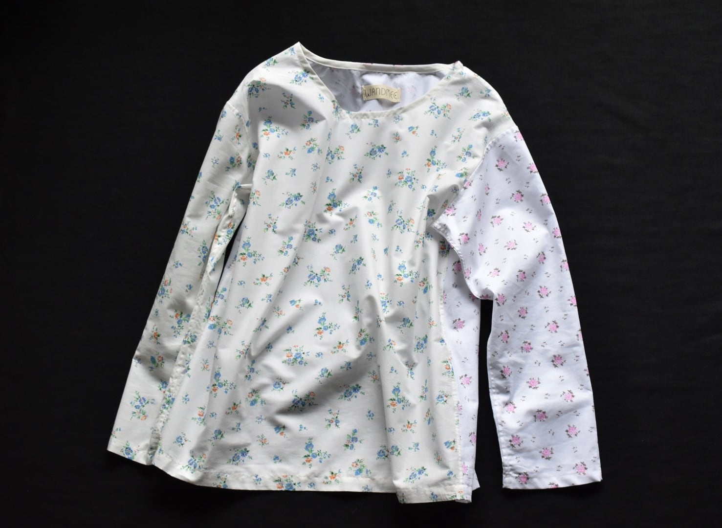 3.前身頃が青、後ろ身頃&両袖共にピンクの小花柄