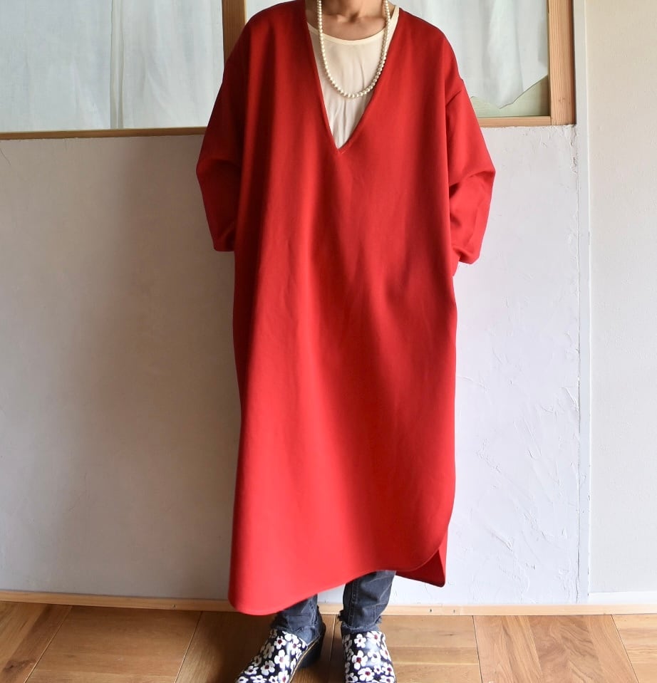 深めに開いたVネックのたっぷりしたリラックスシルエットのワンピース、