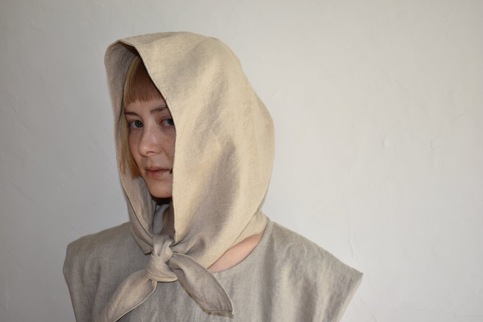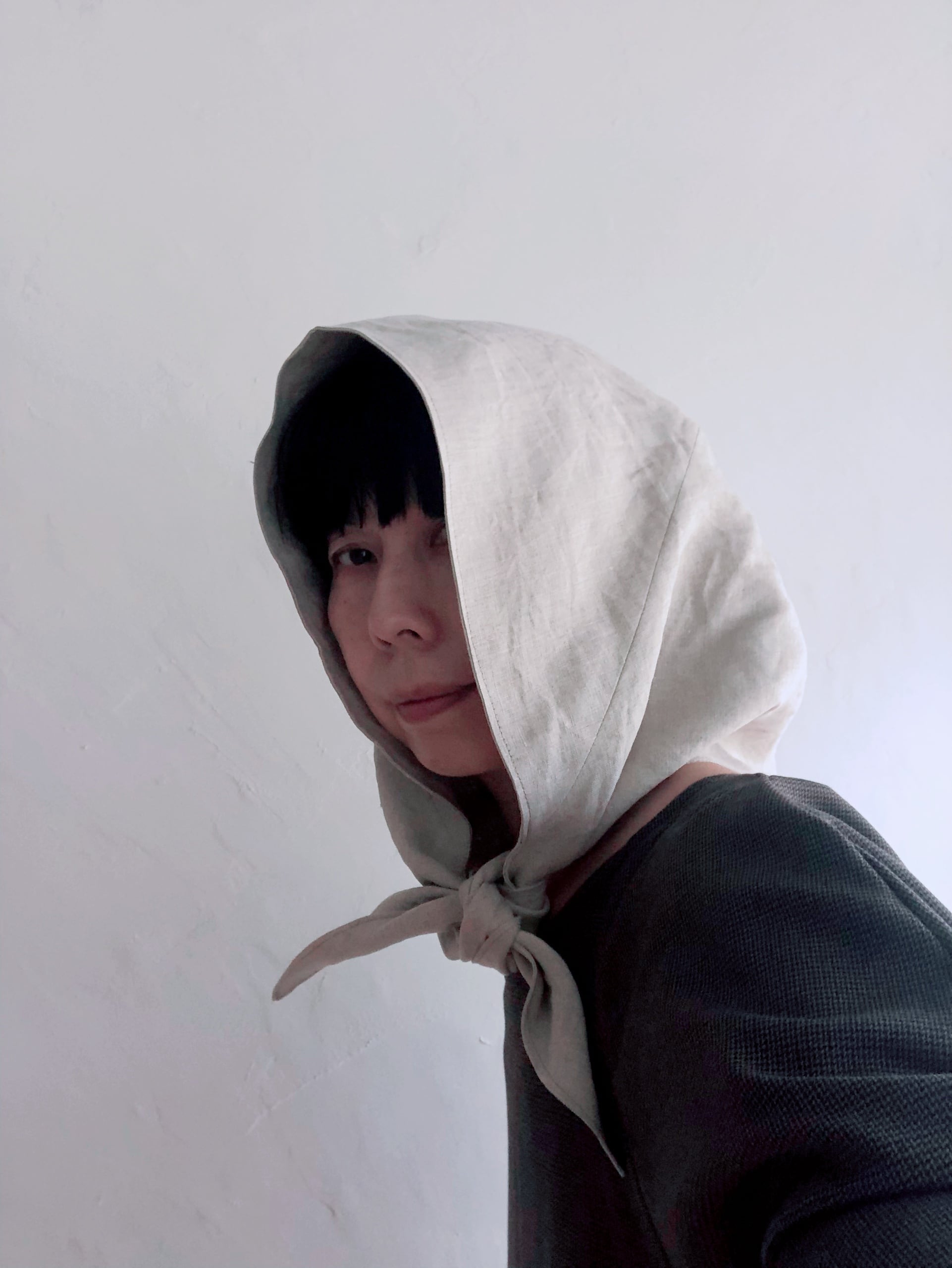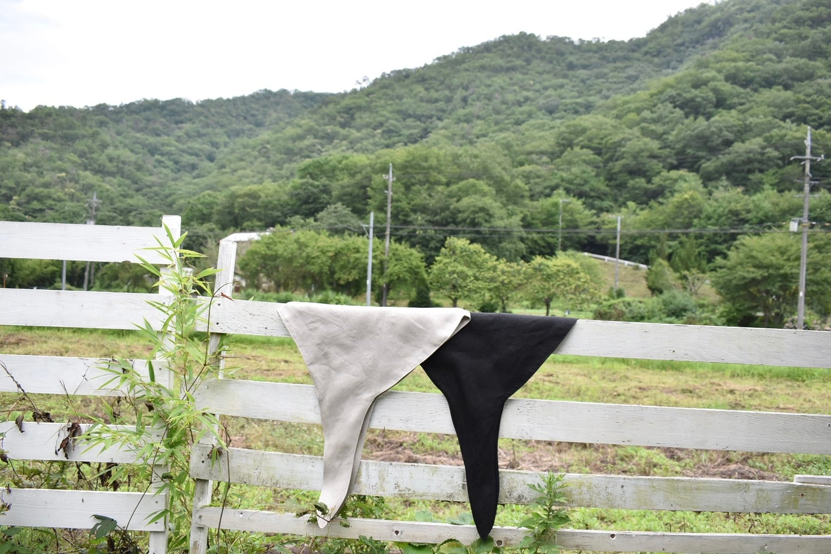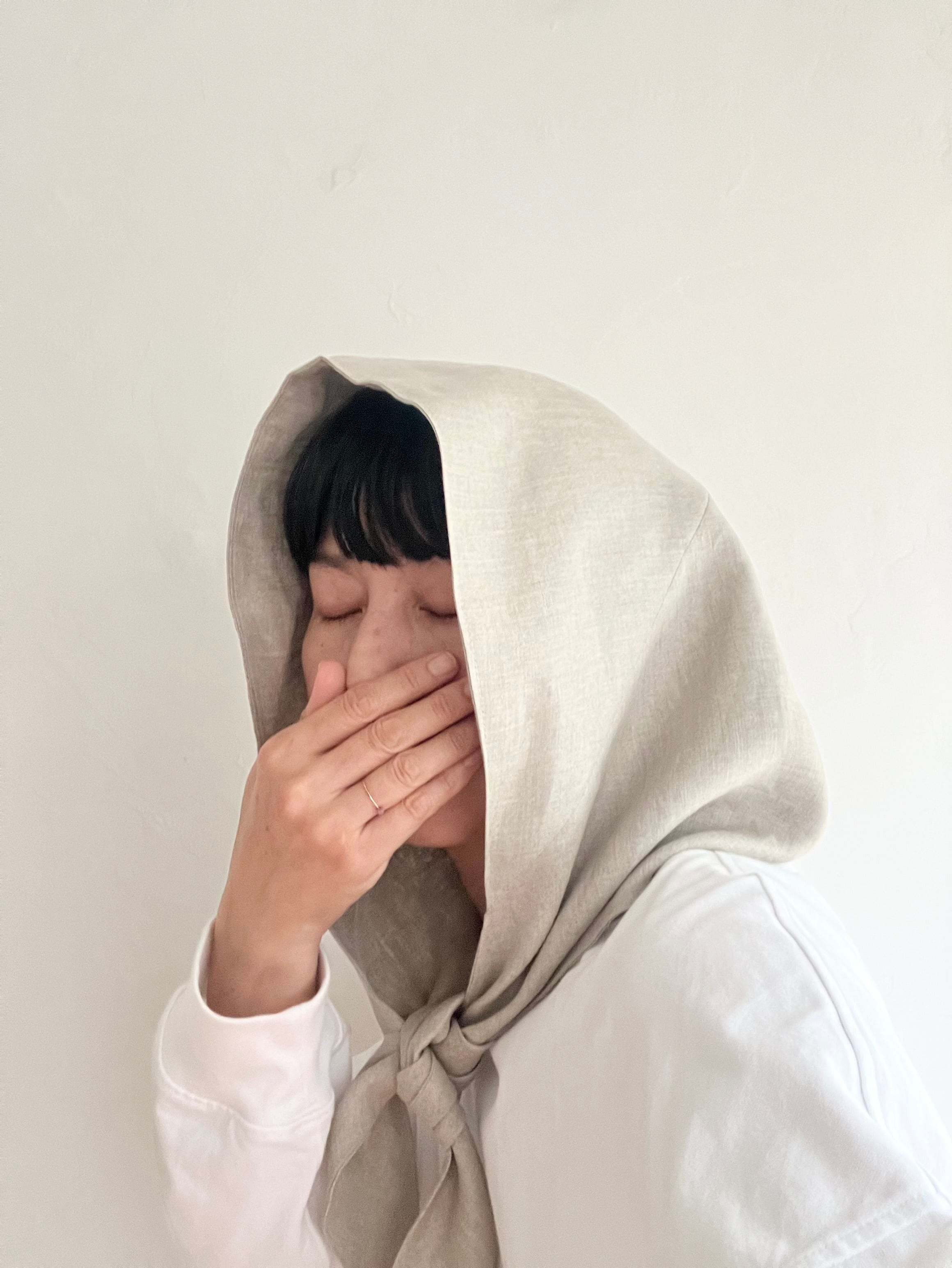 リネン素材は少し硬めの素材感ですが、使っていくうちに柔らかく馴染んでくるかと思います。最初のうちは頭の上で結ぶなどアレンジがしづらいかもしれません。