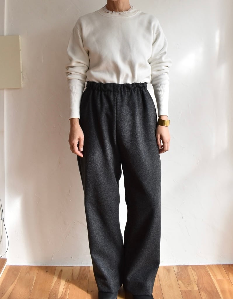 コートにも使われるようなウール素材のウエストゴムのイージーパンツです。