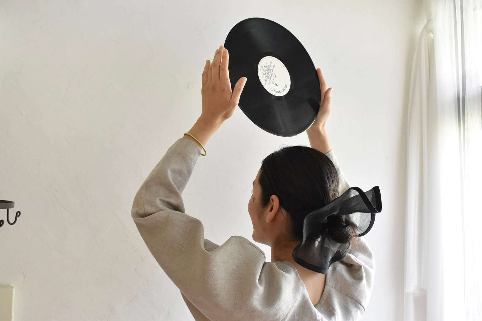 シルクオーガンジー素材のレコード盤の大きさのシュシュです。