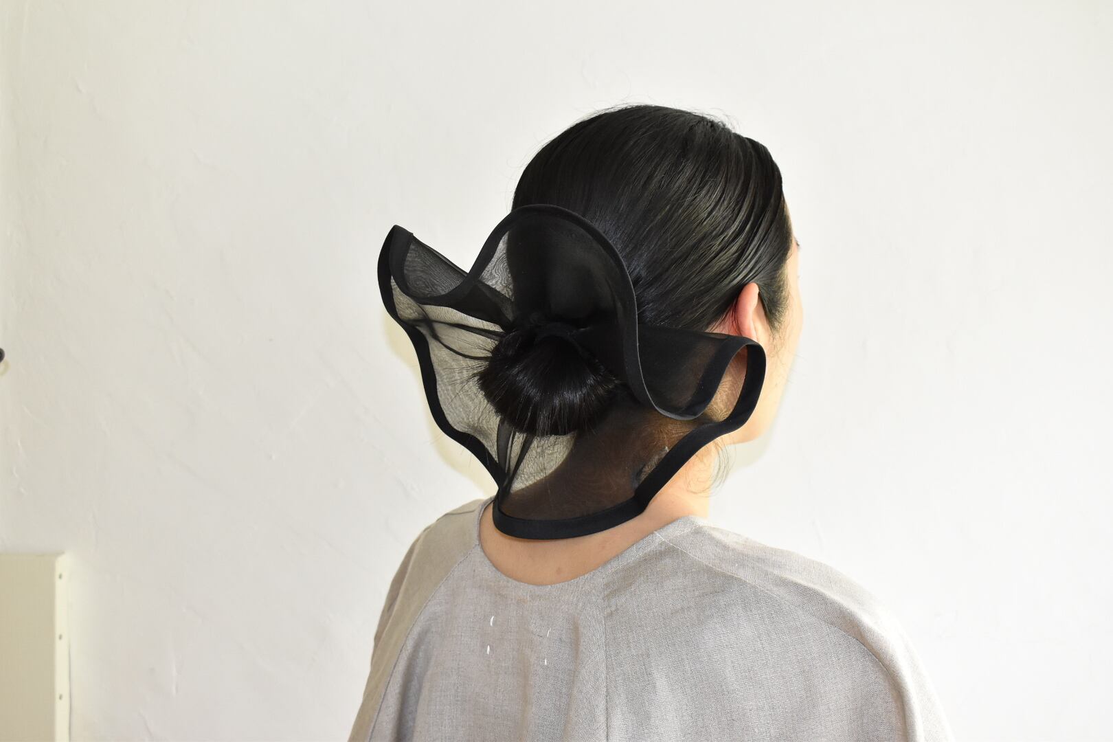 このシュシュで髪の毛を結ぶのではなく、あらかじめ髪の毛をゴムで結んだところにこちらを通して使います。